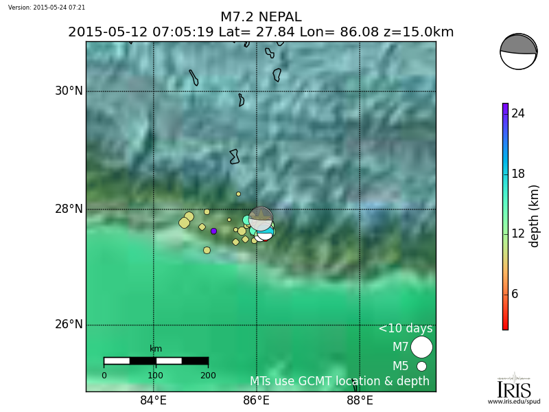 The Aftershocks product consists of an aftershock sequence animation, a map and other figures automatically generated for all events with magnitudes 7.0 and greater. The animation and figures are updated hourly for the first day and then twice daily for the following 9 days. Circle diameters are scaled by magnitude and colors by depth. For recent events, the USGS PDE catalog is used. GCMT focal mechanisms are used when available.